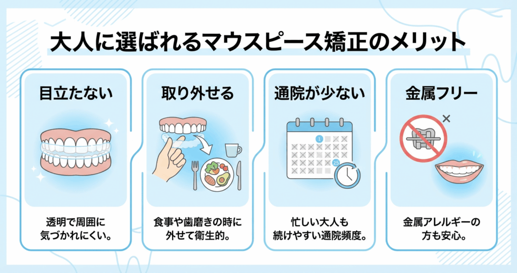 仕事や家庭に追われる毎日。矯正治療というと「目立つ」「面倒くさそう」というイメージが先行しがちです。けれどマウスピース矯正には、そんな不安を和らげてくれる特長がいくつも備わっています。